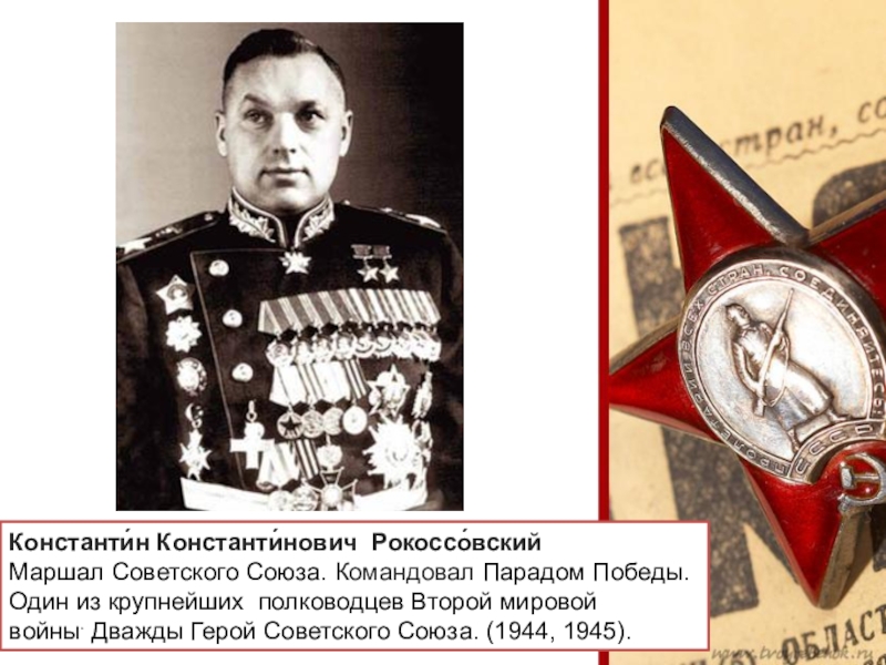 Константи́н Константи́нович  Рокоссо́вскийМаршал Советского Союза. Командовал Парадом Победы. Один из крупнейших полководцев Второй мировой войны. Дважды Герой Советского Союза. (1944, 1945).