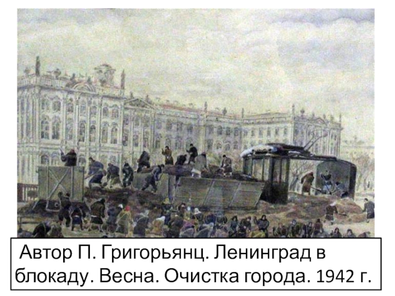 Слайд 15 Автор П. Григорьянц. Ленинград в блокаду. Весна. Очистка города. 1942