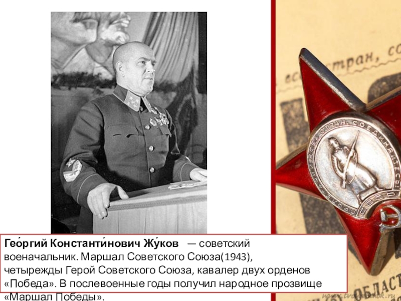 Гео́ргий Константи́нович Жу́ков   — советский военачальник. Маршал Советского Союза(1943), четырежды Герой Советского Союза, кавалер двух орденов «Победа». В послевоенные годы получил