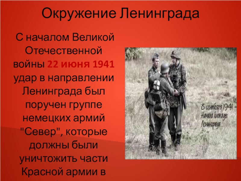 в направлении Ленинграда был поручен группе немецких армий "Север", которые должны были уничтожить части Красной армии в Прибалтике, захватить военно-морские базы на Балтийском море и к 21 июля овладеть Ленинградом.