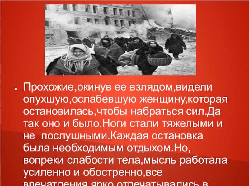 Слайд 9Прохожие,окинув ее взлядом,видели опухшую,ослабевшую женщину,которая остановилась,чтобы набраться сил.Да так оно и