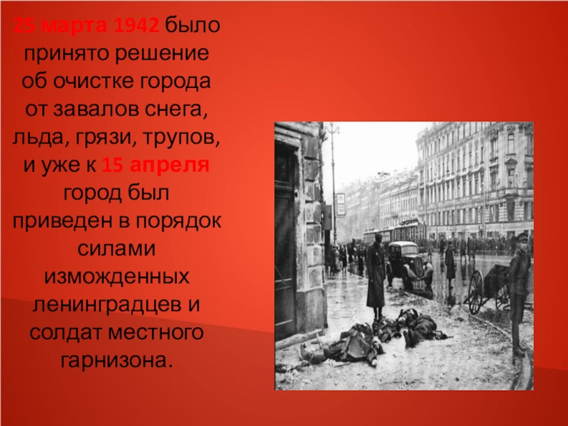 снега, льда, грязи, трупов, и уже к 15 апреля город был приведен в порядок силами изможденных ленинградцев и солдат местного гарнизона.