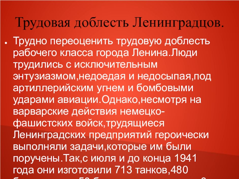 с исключительным энтузиазмом,недоедая и недосыпая,под артиллерийским угнем и бомбовыми ударами авиации.Однако,несмотря на варварские действия немецко-фашистских войск,трудящиеся Ленинградских предприятий героически выполняли задачи,которые им были поручены.Так,с июля и до конца 1941 года они изготовили 713 танков,480 бронемашин,58 бронепоездов,свыше 3-х тысяч полковых и противотанковых пушек,около 10 тысяч минометов,свыше 3-х миллионов снарядов и мин,более 80 тысяч снарядов и бомб.Выпуск боеприпасов во вотором полугодии 1941 года по сравнению с первым увеличился в 10 раз.