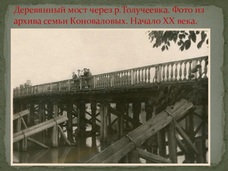 Слайд 23Деревянный мост через р.Толучеевка. Фото из архива семьи Коноваловых. Начало XX