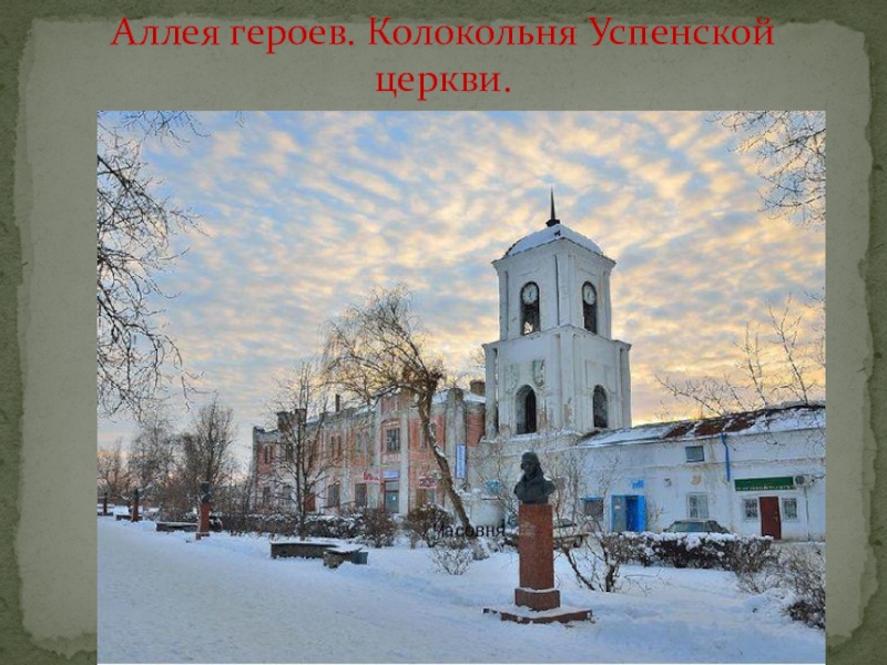 Слайд 64Аллея героев. Колокольня Успенской церкви.