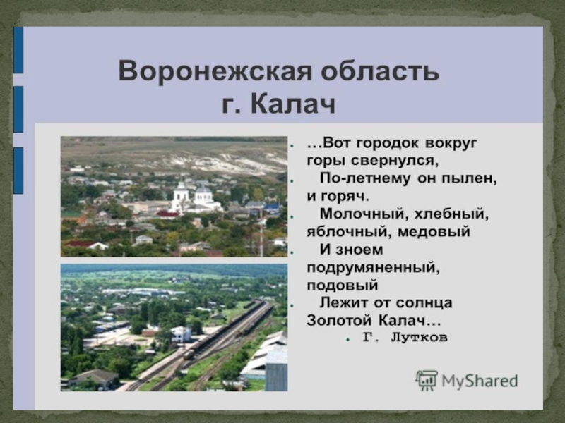 Калач  Есть на свете город русский, Очень сдобный, очень вкусный, И душист он и горяч – Называется Калач. Калачом свернулась речка И бежит, бежит журча… Светит месяц над крылечком Половинкой калача. Если в