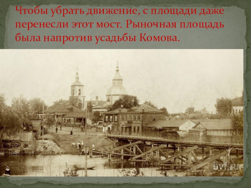 Чтобы убрать движение, с площади даже перенесли этот мост. Рыночная площадь была напротив усадьбы Комова.