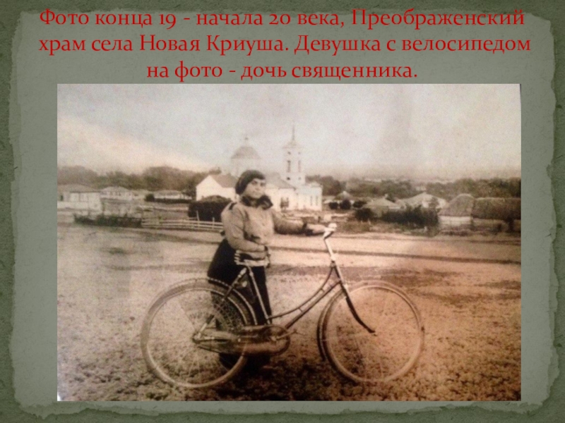 Фото конца 19 - начала 20 века, Преображенский храм села Новая Криуша. Девушка с велосипедом на фото