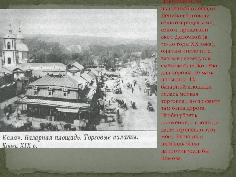 Слайд 14По рассказам старожила М.И. Покусаевой, на нынешней площади Ленина торговали сельхозпродуктами,