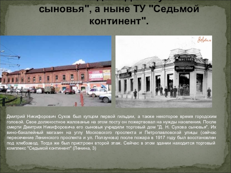 Дмитрий Никифорович Сухов был купцом первой гильдии, а также некоторое время городским головой. Свое должностное жалованье на этом посту он пожертвовал на нужды населения. После смерти Дмитрия Никифоровича его сыновья учредили торговый дом "Д. Н. Сухова сыновья". Их вино-бакалейный магазин на углу Московского проспекта и Петропавловской улицы (сейчас пересечение Ленинского проспекта и ул. Ползунова) после пожара в 1917 году был восстановлен под хлебзавод. Тогда же был пристроен второй этаж. Сейчас в этом здании находится торговый комплекс "Седьмой континент" (Ленина, 3)