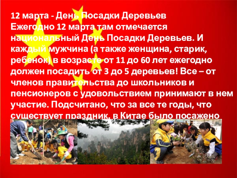 День Посадки Деревьев. И каждый мужчина (а также женщина, старик, ребенок) в возрасте от 11 до 60 лет ежегодно должен посадить от 3 до 5 деревьев! Все – от членов правительства до школьников и пенсионеров с удовольствием принимают в нем участие. Подсчитано, что за все те годы, что существует праздник, в Китае было посажено около 50 миллиардов деревьев.