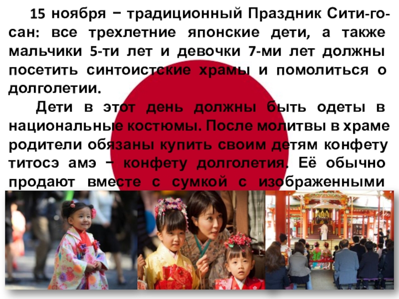 Слайд 3 15 ноября − традиционный Праздник Сити-го-сан: все трехлетние японские