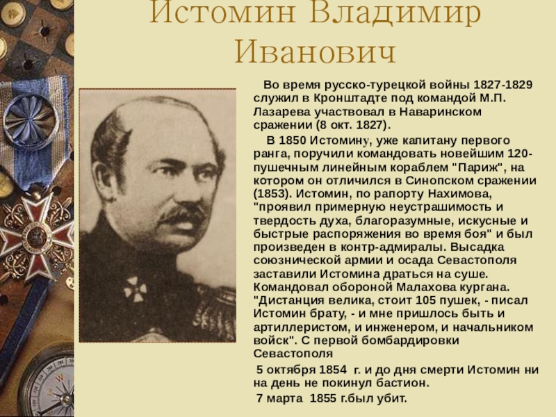 Степанович Нахимов родился в семье офицера. участвовал в Наваринском сражении 1827 года. В 1845 году Нахимов был произведен в контр-адмиралы и назначен командиром бригады кораблей.