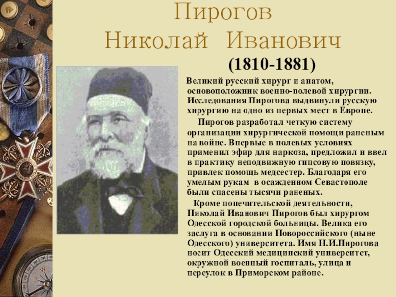Великий русский хирург и анатом,основоположник военно-полевой хирургии. Исследования Пирогова выдвинули русскую хирургию на одно из первых мест в Европе.