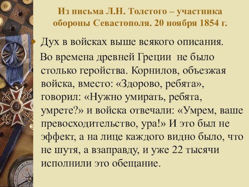 Слайд 10Из письма Л.Н. Толстого – участника обороны Севастополя. 20 ноября 1854