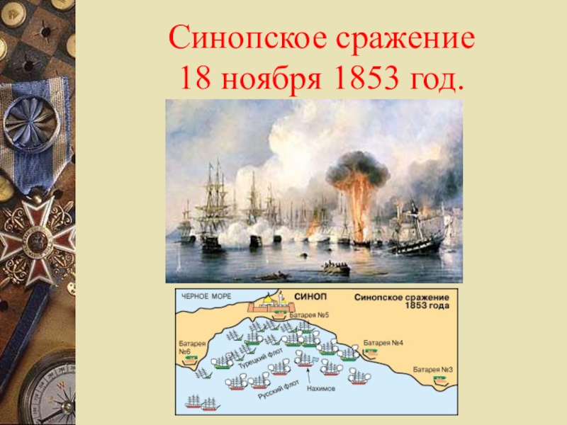 Во время Крымской войны 1853-1856 годов, командуя эскадрой кораблей Черноморского флота, Нахимов обнаружил и заблокировал в Синопе главные силы турецкого флота, а