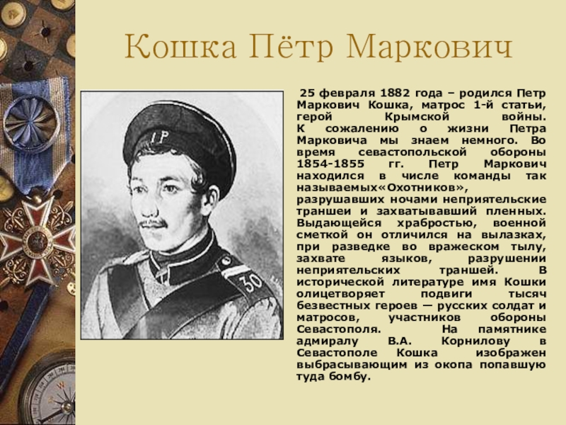 К сожалению о жизни Петра Марковича мы знаем немного. Во время севастопольской обороны 1854-1855 гг. Петр Маркович находился в числе команды так называемых«Охотников», разрушавших ночами неприятельские траншеи и захватывавший пленных. Выдающейся храбростью, военной сметкой он отличился на вылазках, при разведке во вражеском тылу, захвате языков, разрушении неприятельских траншей. В исторической литературе имя Кошки олицетворяет подвиги тысяч безвестных героев — русских солдат и матросов, участников обороны Севастополя. На памятнике адмиралу В.А. Корнилову в Севастополе Кошка изображен выбрасывающим из окопа попавшую туда бомбу.