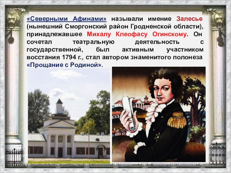 Слайд 11«Северными Афинами» называли имение Залесье (нынешний Сморгонский район Гродненской области), принадлежавшее