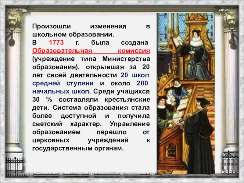 комиссия (учреждение типа Министерства образования), открывшая за 20 лет своей деятельности 20 школ средней ступени и около 200 начальных школ. Среди учащихся 30 % составляли крестьянские дети. Система образования стала более доступной и получила светский характер. Управление образованием перешло от церковных учреждений к государственным органам.
