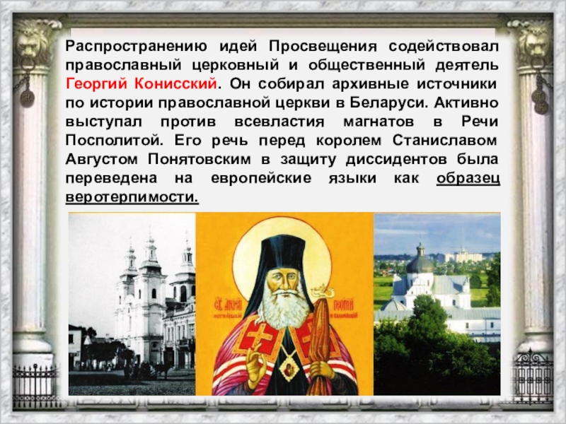 Слайд 5Распространению идей Просвещения содействовал православный церковный и общественный деятель Георгий Конисский.
