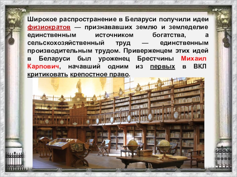 Слайд 6Широкое распространение в Беларуси получили идеи физиократов — признававших землю и