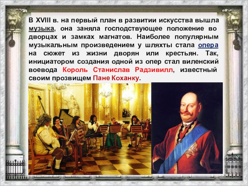 она заняла господствующее положение во дворцах и замках магнатов. Наиболее популярным музыкальным произведением у шляхты стала опера на сюжет из жизни дворян или крестьян. Так, инициатором создания одной из опер стал виленский воевода Король Станислав Радзивилл, известный своим прозвищем Пане Коханку.