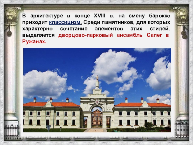 Среди памятников, для которых характерно сочетание элементов этих стилей, выделяется дворцово-парковый ансамбль Сапег в Ружанах.