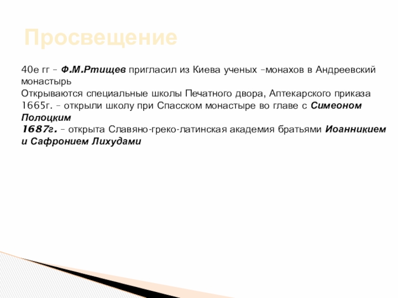 40е гг – Ф.М.Ртищев пригласил из Киева ученых –монахов в Андреевский