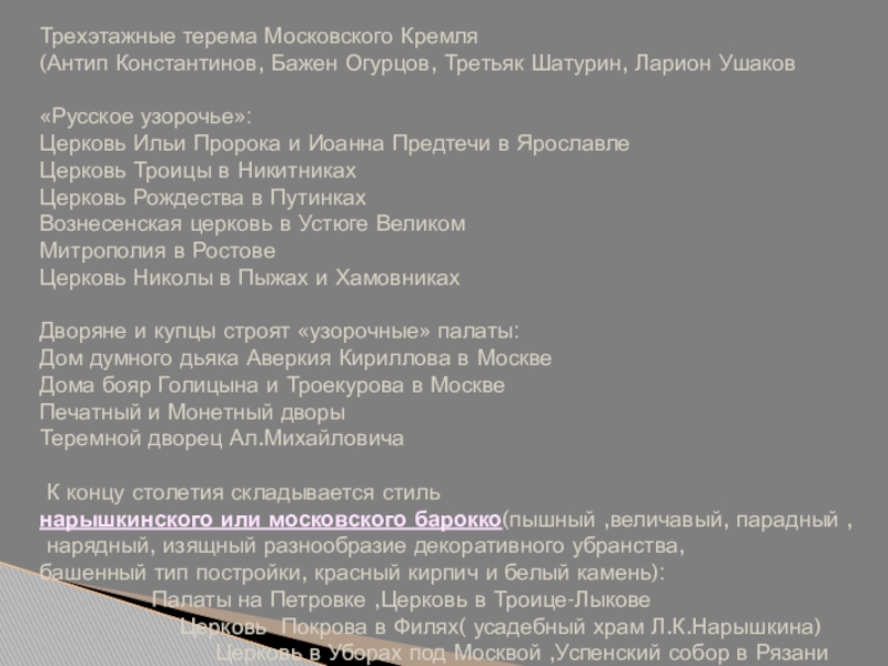 нарышкинского или московского барокко(пышный ,величавый, парадный ,