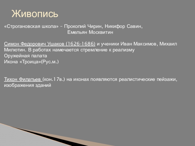 Тихон Филатьев (кон.17в.) на иконах появляются реалистические пейзажи, изображения зданий