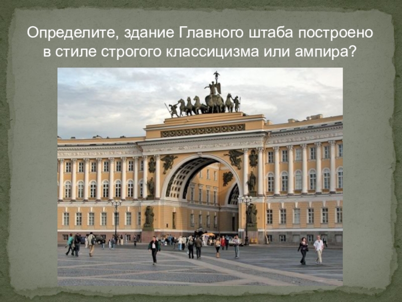 Слайд 12Определите, здание Главного штаба построено в стиле строгого классицизма или ампира?