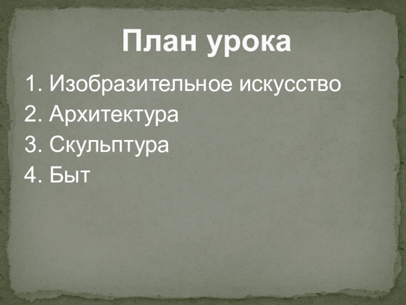1. Изобразительное искусство2. Архитектура3. Скульптура4. БытПлан урока