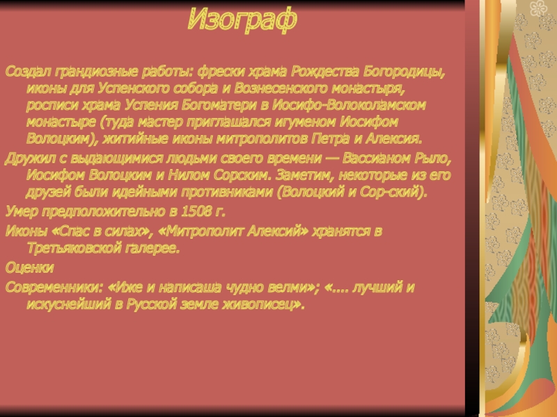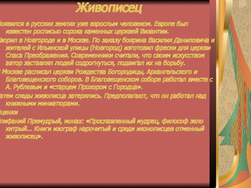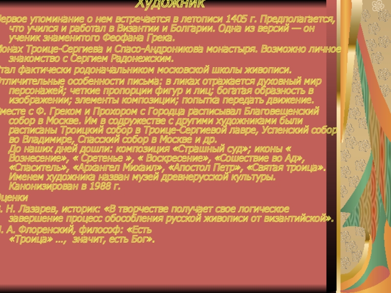 Художник Первое упоминание о нем встречается в летописи 1405 г. Предполагается, что учился и работал в Византии