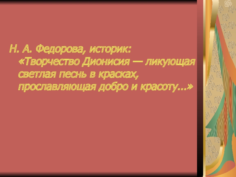Н. А. Федорова, историк: «Творчество Дионисия — ликующая светлая песнь в красках, прославляющая добро и красоту...»