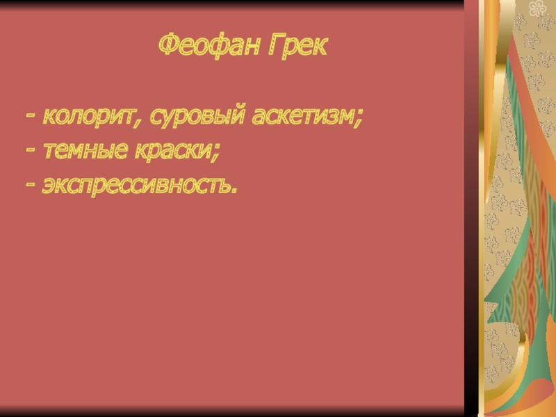 Феофан Грек колорит, суровый аскетизм;темные краски;экспрессивность.