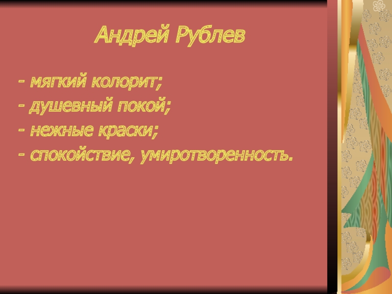 Андрей Рублевмягкий колорит;душевный покой;нежные краски;спокойствие, умиротворенность.