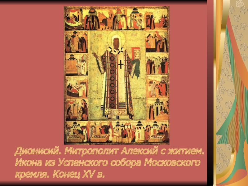 Слайд 19Дионисий. Митрополит Алексий с житием. Икона из Успенского собора Московского кремля.