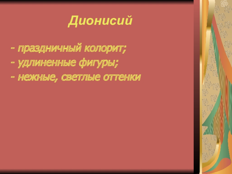 Дионисийпраздничный колорит;удлиненные фигуры;нежные, светлые оттенки