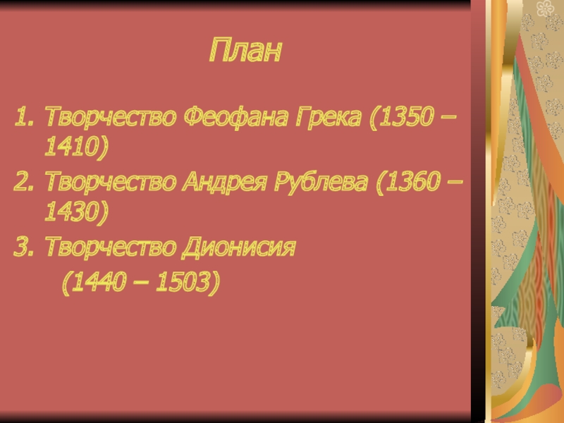 ПланТворчество Феофана Грека (1350 – 1410)Творчество Андрея Рублева (1360 – 1430)Творчество Дионисия   (1440 – 1503)