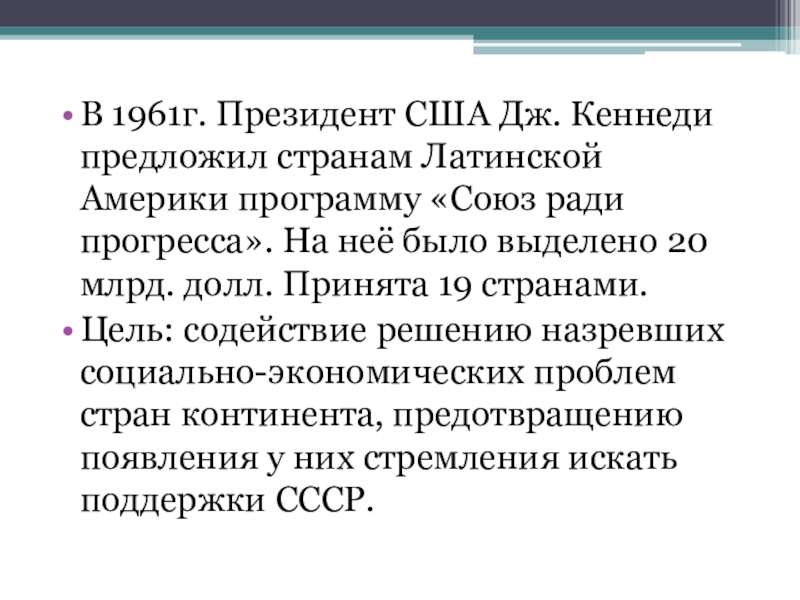 В 1961г. Президент США Дж. Кеннеди предложил странам Латинской Америки программу