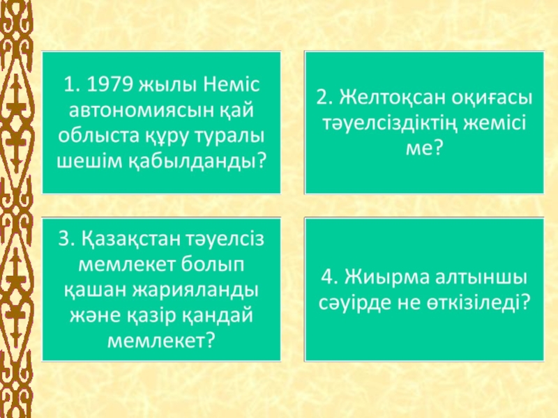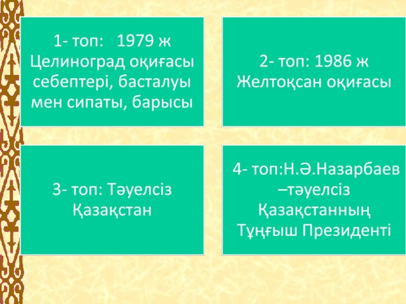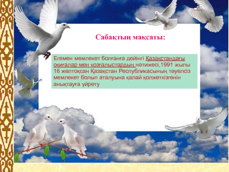 Егемен мемлекет болғанға дейінгі Қазақстандағы оқиғалар мен қозғалыстардың нәтижесі,1991 жылы 16 желтоқсан Қазақстан Республикасының тәуелсіз мемлекет болып аталуына қалай қолжеткізгенін анықтауға үйрету