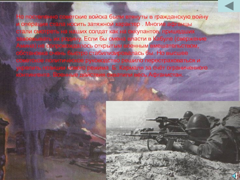 Но постепенно советские войска были втянуты в гражданскую войну и операция стала носить затяжной характер . Многие афганцы стали смотреть на наших солдат как на оккупантов, пришедших завоевывать их родину. Если бы смена власти в Кабуле (свержение Амина) не сопровождалось открытым военным вмешательством, обстановка очень быстро стабилизировалась бы. Но высшее советское политическое руководство решило перестраховаться и укрепить позиции нового режима Б. Кармаля за счёт ограниченного контингента. Военные действия охватили весь Афганистан.