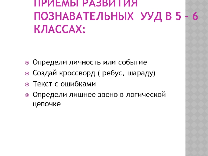 Слайд 13ПРИЁМЫ РАЗВИТИЯ ПОЗНАВАТЕЛЬНЫХ УУД В 5 – 6 КЛАССАХ: