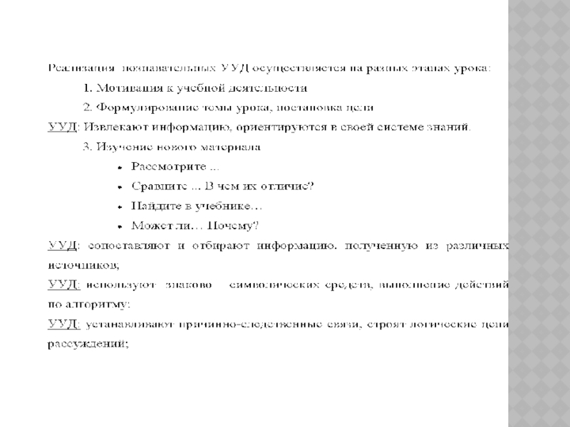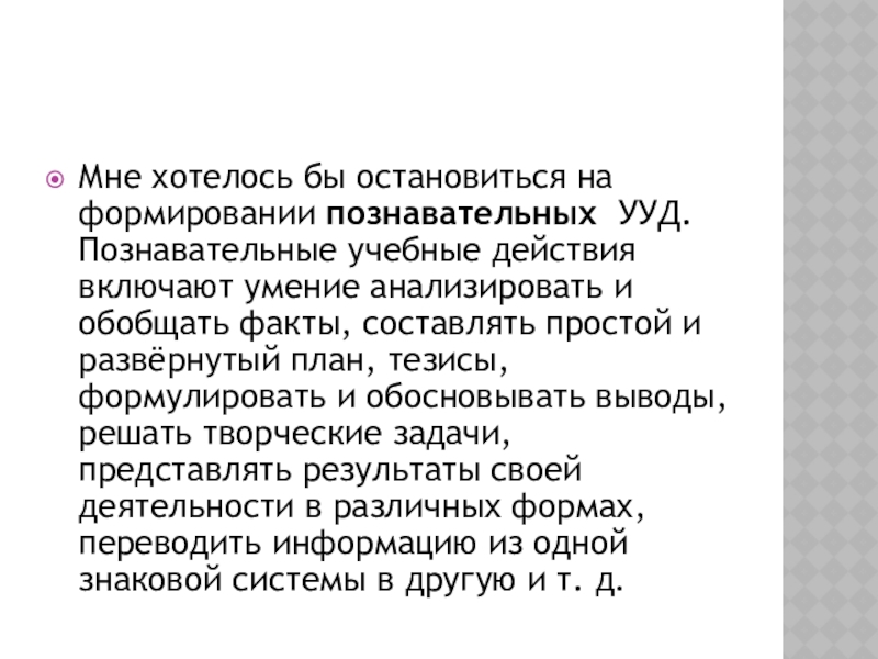 Мне хотелось бы остановиться на формировании познавательных УУД. Познавательные учебные действия включают умение