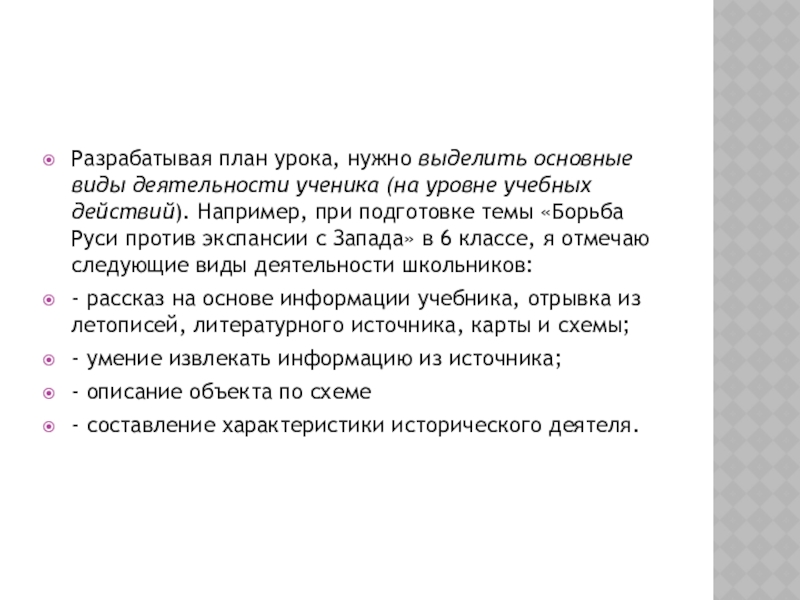 учебных действий). Например, при подготовке темы «Борьба Руси против экспансии с Запада» в 6 классе, я отмечаю следующие виды деятельности школьников:
