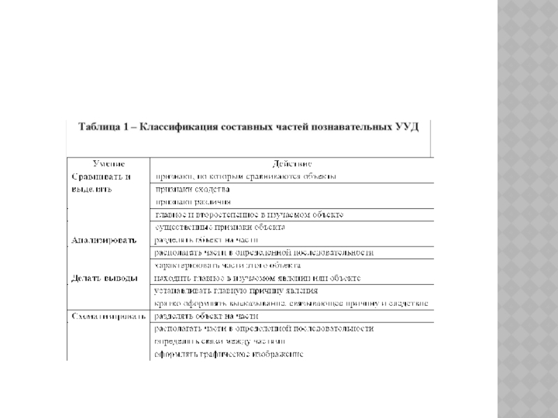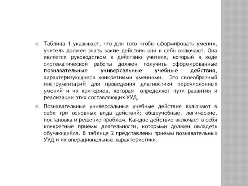 знать какие действия они в себя включают. Она является руководством к действию учителя, который в ходе систематической работы должен получить сформированные познавательные универсальные учебные действия, характеризующиеся конкретными умениями. Это своеобразный инструментарий для проведения диагностики перечисленных умений и их критериев, которая определяет пути развития и реализации этих составляющих УУД.