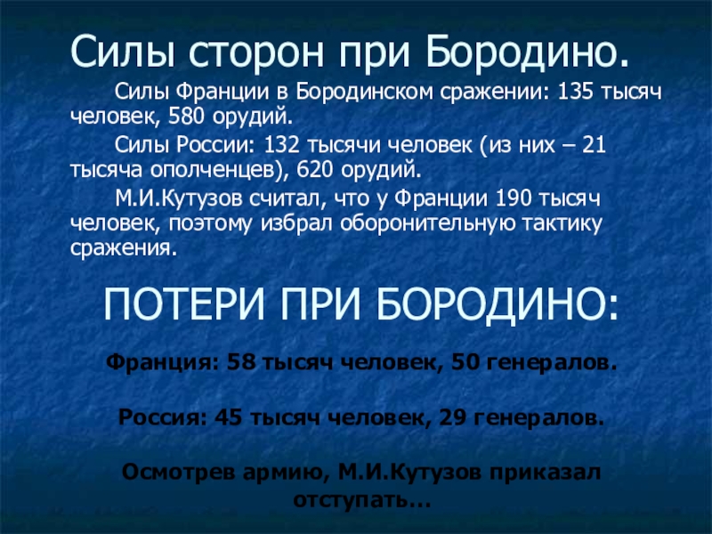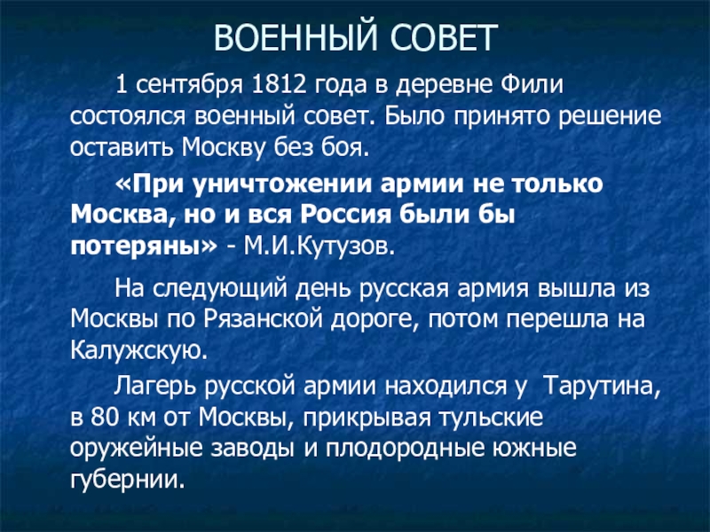 Осмотрев армию, М.И.Кутузов приказал отступать…