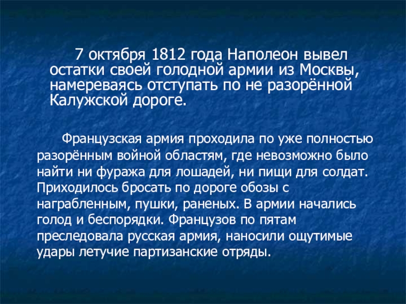 7 октября 1812 года Наполеон вывел остатки своей голодной армии из Москвы, намереваясь отступать по не разорённой Калужской дороге.