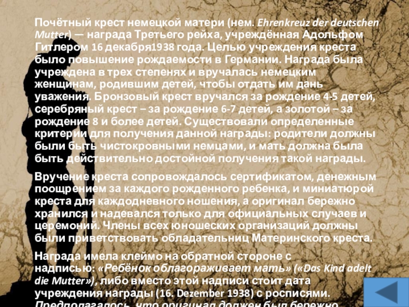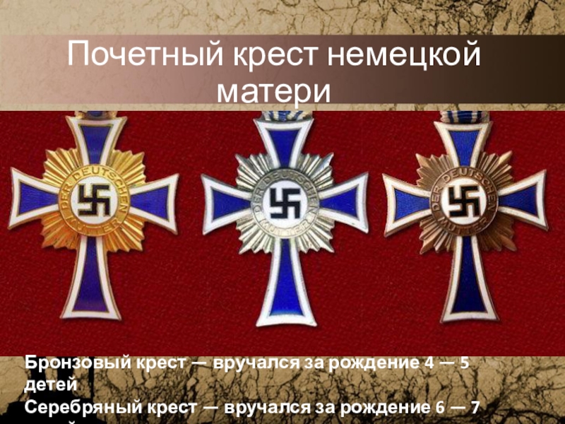 Слайд 18Почётный крест немецкой матери (нем. Ehrenkreuz der deutschen Mutter) — награда Третьего рейха, учреждённая Адольфом Гитлером 16