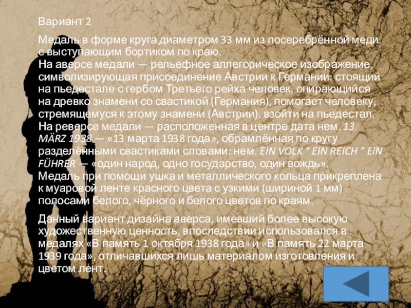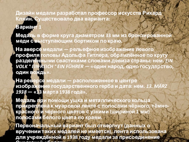 Слайд 10Дизайн медали разработал профессор искусств Рихард Кляйн. Существовало два варианта:
